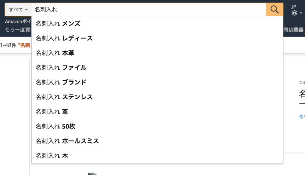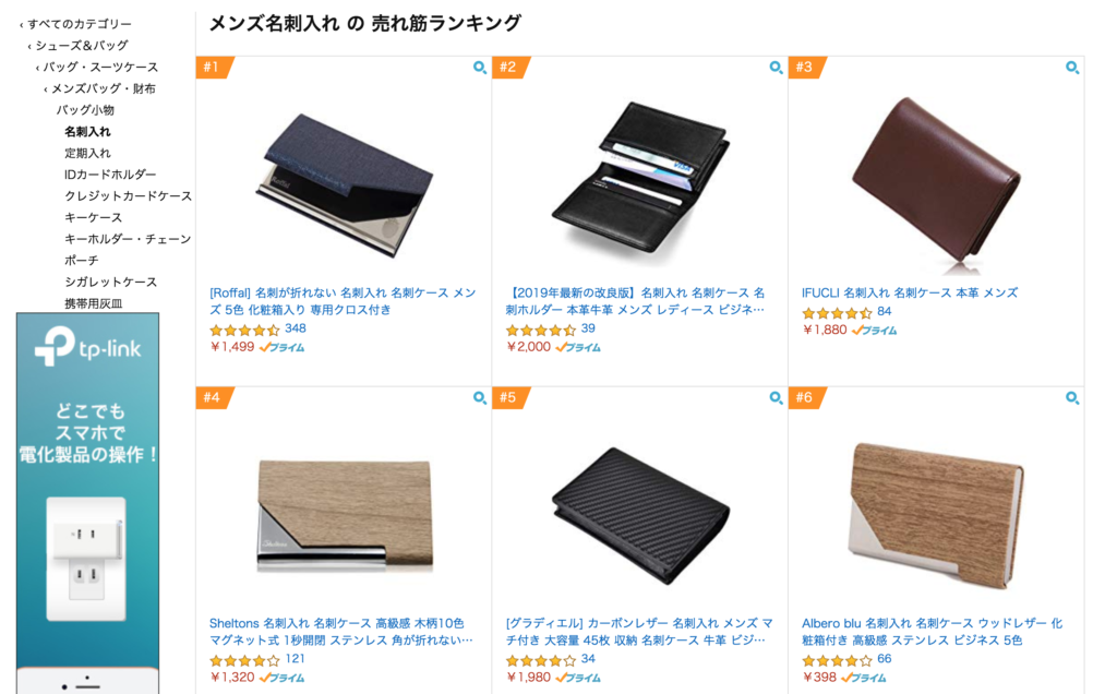 小カテゴリーから好条件の商品が見つかったらその商品名をAmazonで検索してみます。今回の場合は【名刺入れ】で検索します。